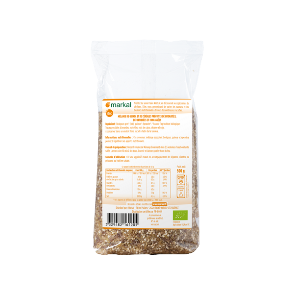 Boulgour gros* (blé), quinoa*, épeautre* concassé. *Issu de l'agriculture biologique.